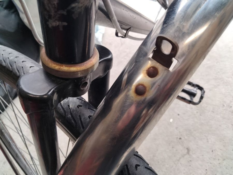 前の泥除けがカタカタいっていたので見てみると この二つのカシメがガタガタしていた。 よくあることで泥除け交換になるんやが カシメを壊してドリルで穴を開けてねじ止めにする。 それで交換しなくても使える。 あとはブレーキ系をワイヤー交換とブレーキシュ交換。 タイヤはひび割れもなくまだまだ大丈夫だったのでそのままで。 これで歩生の自転車は整備完了。 次はMIWAの自転車やね。 来週は9月ぶりのバイトへ。 やっとお声がかかった。